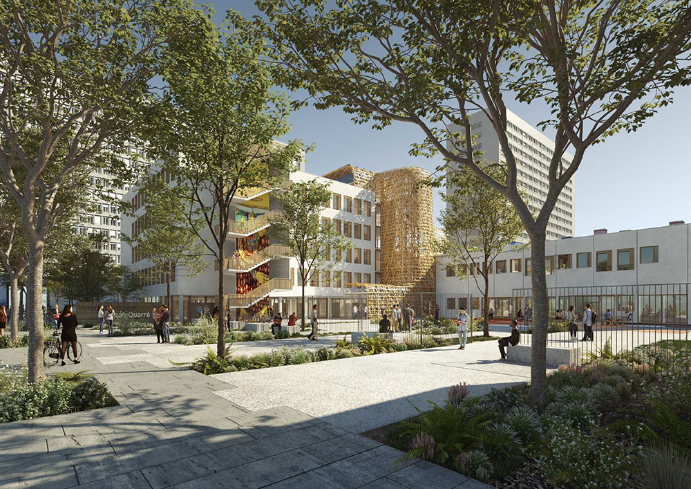 Ce projet, qui s’inscrit sur un site de 6 000 m² comprenant deux bâtiments de l’ancien lycée hôtelier Jean Quarré, est exemplaire et précurseur en matière de transition écologique. Deux opérations sont prévues : une médiathèque de quartier et une maison des réfugiés. La médiathèque s'installera dans le bâtiment A dont sont uniquement conservés la structure et les plateaux. Le co-working, le café et la salle polyvalente s'installent dans le bâtiment B et fonctionnent de façon autonome. Le projet comprend également la création d’un espace ouvert et connecté au quartier, avec plusieurs terrasses paysagées. Construction nouvelle en bois et terre crue.
